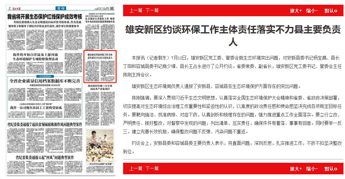 河北日报:雄安新区约谈环保工作主体责任落实不力县主要负责人