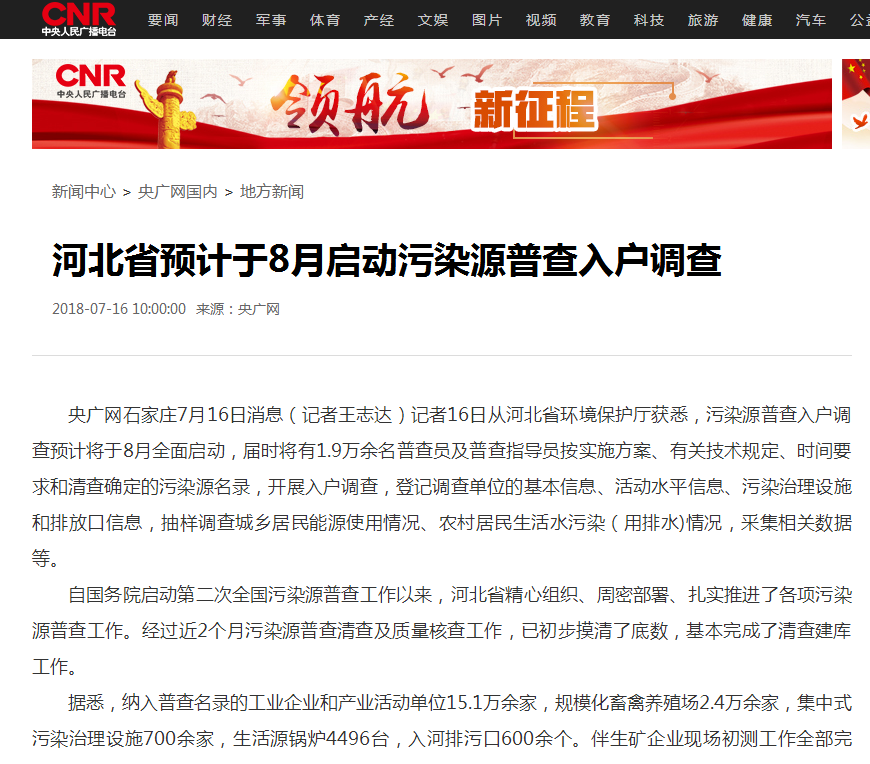 央广网石家庄7月16日消息(记者王志达)记者16日从河北省环境保护厅获悉,污染源普查入户调查预计将于8月全面启动,届时将有1.9万余名普查员及普查指导员按实施方案、有关技术规定、时间要求和清查确定的污染源名录,开展入户调查,登记调查单位的基本信息、活动水平信息、污染治理设施和排放口信息,抽样调查城乡居民能源使用情况、农村居民生活水污染(用排水)情况,采集相关数据等。