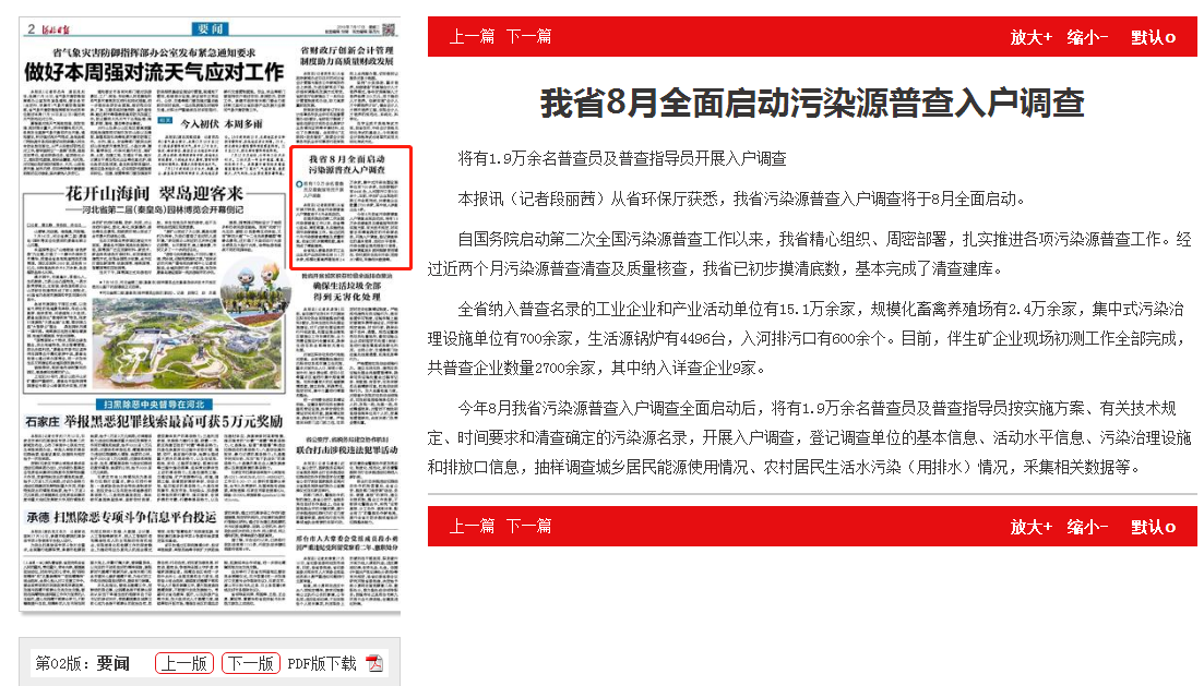 本报讯(记者段丽茜)从省环保厅获悉,我省污染源普查入户调查将于8月全面启动。