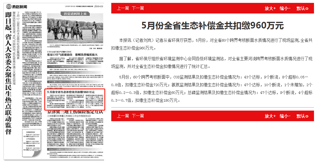 燕赵都市报:5月份全省生态补偿金共扣缴960万元