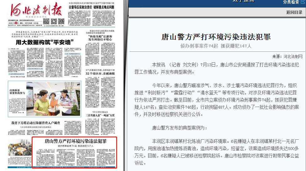 河北法制报:唐山警方严打环境污染违法犯罪 侦办刑事案件74起 抓获嫌犯147人