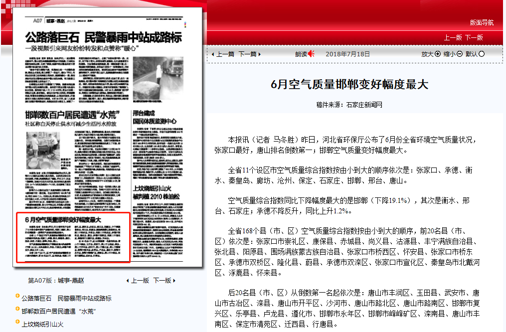 燕赵晚报:6月空气质量邯郸变好幅度最大 来源:省生态环境宣传教育中心 时间:2018-07-18