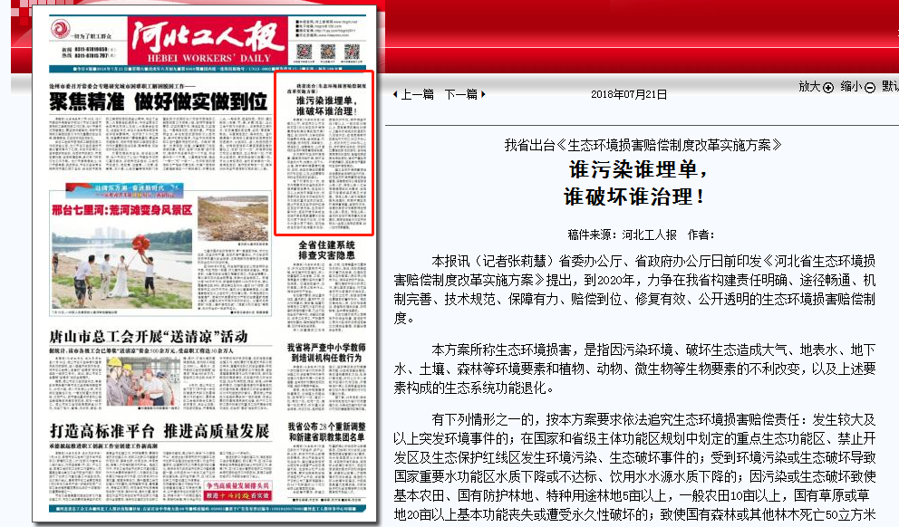 河北工人报:我省出台《生态环境损害赔偿制度改革实施方案》 谁污染谁埋单,谁破坏谁治理! 来源:省生态环境宣传教育中心 时间:2018-07-21