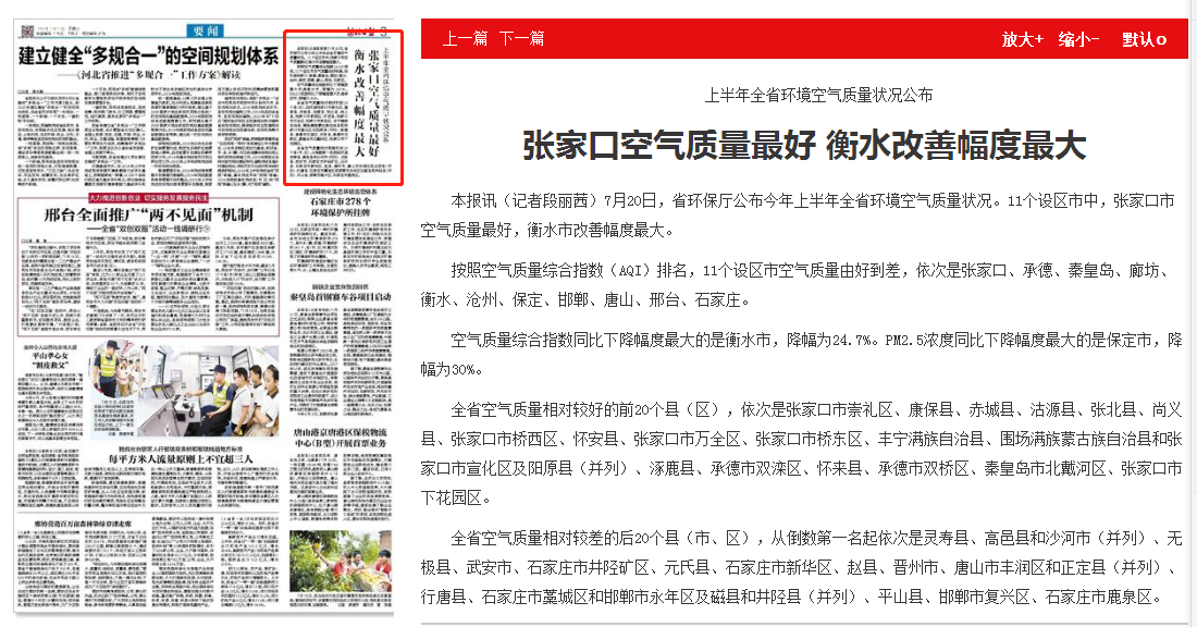 河北日报:上半年全省环境空气质量状况公布 张家口空气质量最好 衡水改善幅度最大