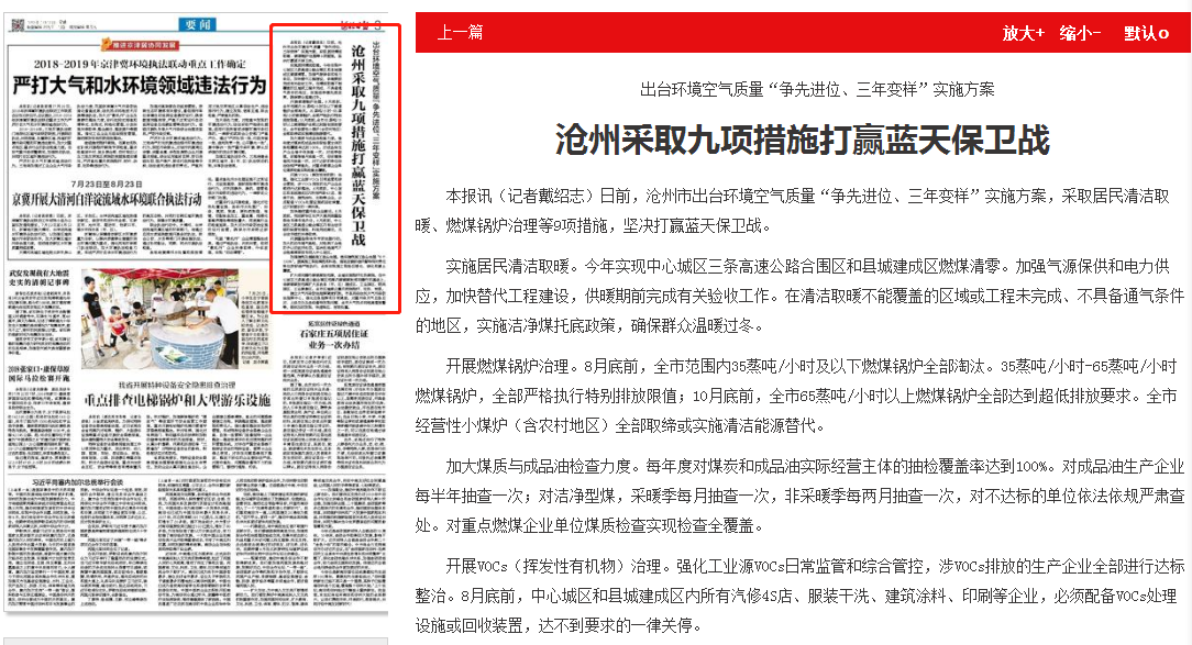 本报讯(记者戴绍志)日前,沧州市出台环境空气质量“争先进位、三年变样”实施方案,采取居民清洁取暖、燃煤锅炉治理等9项措施,坚决打赢蓝天保卫战。