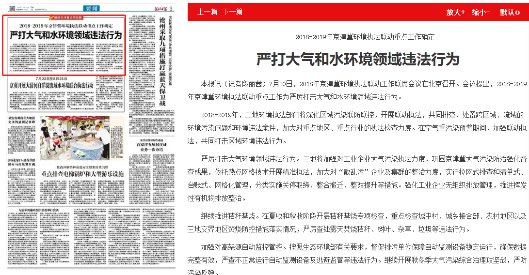 本报讯(记者段丽茜)7月20日,2018年京津冀环境执法联动工作联席会议在北京召开。会议提出,2018-2019年京津冀环境执法联动重点工作为严厉打击大气和水环境领域违法行为。