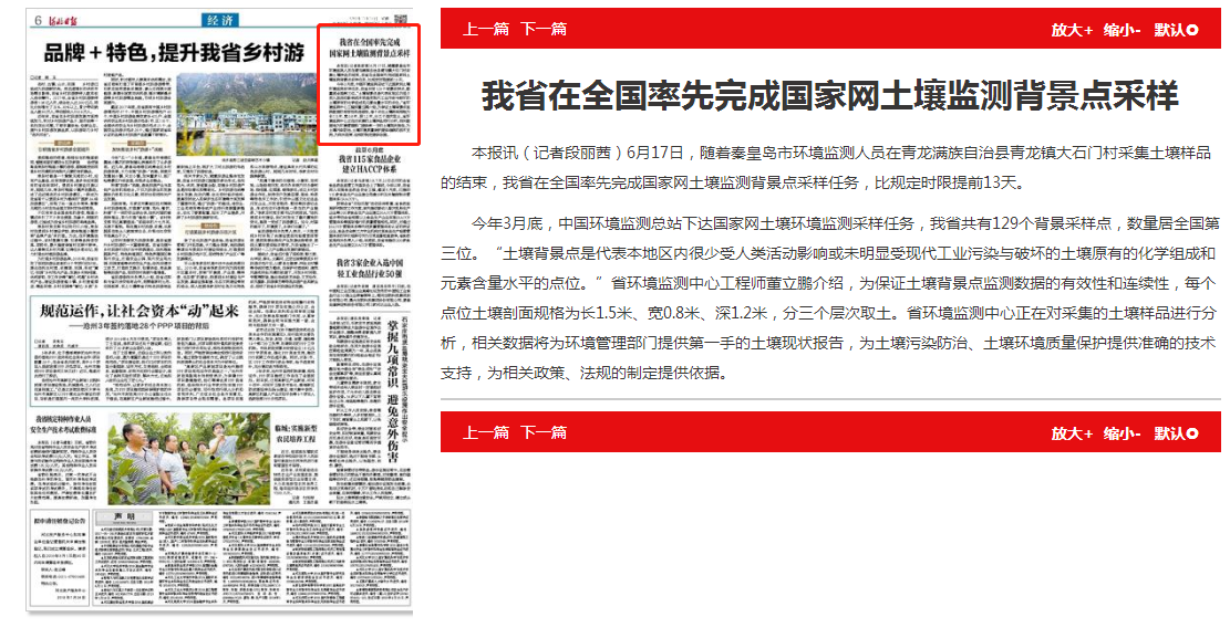 本报讯(记者段丽茜)6月17日,随着秦皇岛市环境监测人员在青龙满族自治县青龙镇大石门村采集土壤样品的结束,我省在全国率先完成国家网土壤监测背景点采样任务,比规定时限提前13天。