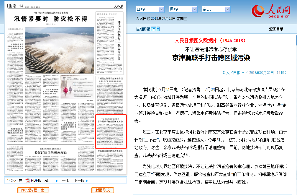 本报北京7月24日电 (记者贺勇)7月23日起,北京与河北环保执法人员联合在大清河、白洋淀流域开展为期一个月的协同执法行动,重点对水污染物排入地表企业、垃圾处置设施、各级污水处理厂和印染、制革等重点行业企业、涉污“散乱污”企业等开展检查和检测,严厉打击污染水环境违法行为,促进跨界流域水环境质量改善。