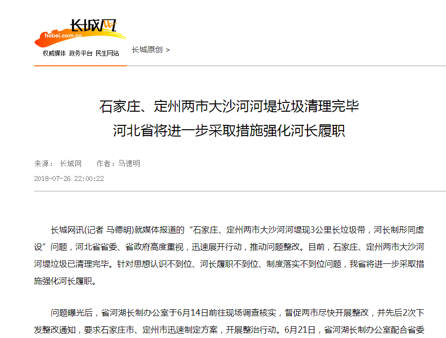 长城网讯(记者 马德明)就媒体报道的“石家庄、定州两市大沙河河堤现3公里长垃圾带,河长制形同虚设”问题,河北省委、省政府高度重视,迅速展开行动,推动问题整改。目前,石家庄、定州两市大沙河河堤垃圾已清理完毕。针对思想认识不到位、河长履职不到位、制度落实不到位问题,我省将进一步采取措施强化河长履职。