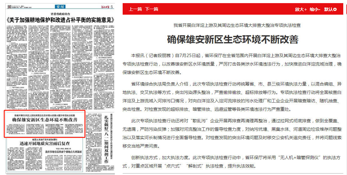本报讯(记者段丽茜)自7月25日起,省环保厅在全省范围内开展白洋淀上游及其周边生态环境大排查大整治专项执法检查行动,以改善雄安新区水环境质量,严厉打击各类涉水环境违法行为,加快推进白洋淀流域治理,确保雄安新区生态环境不断改善。