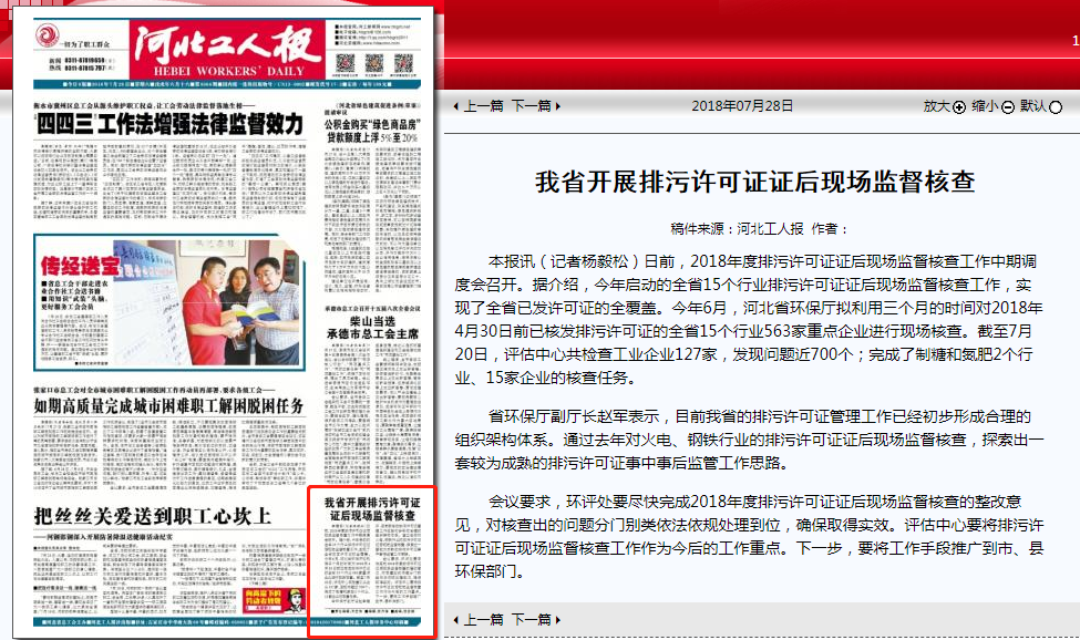 本报讯(记者杨毅松)日前,2018年度排污许可证证后现场监督核查工作中期调度会召开。据介绍,今年启动的全省15个行业排污许可证证后现场监督核查工作,实现了全省已发许可证的全覆盖。今年6月,河北省环保厅拟利用三个月的时间对2018年4月30日前已核发排污许可证的全省15个行业563家重点企业进行现场核查。截至7月20日,评估中心共检查工业企业127家,发现问题近700个;完成了制糖和氮肥2个行业、15家企业的核查任务。