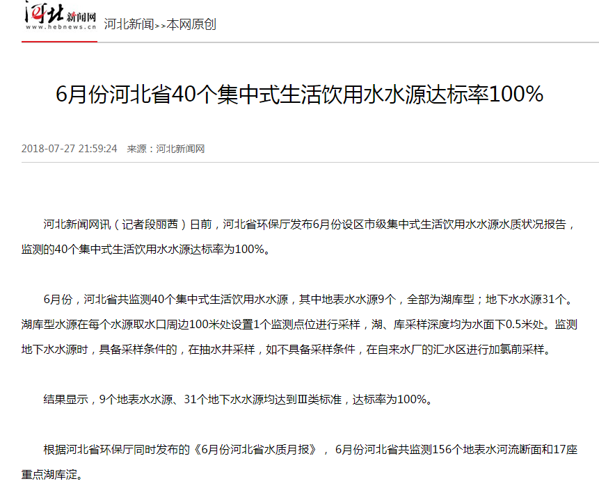 河北新闻网讯(记者段丽茜)日前,河北省环保厅发布6月份设区市级集中式生活饮用水水源水质状况报告,监测的40个集中式生活饮用水水源达标率为100%。