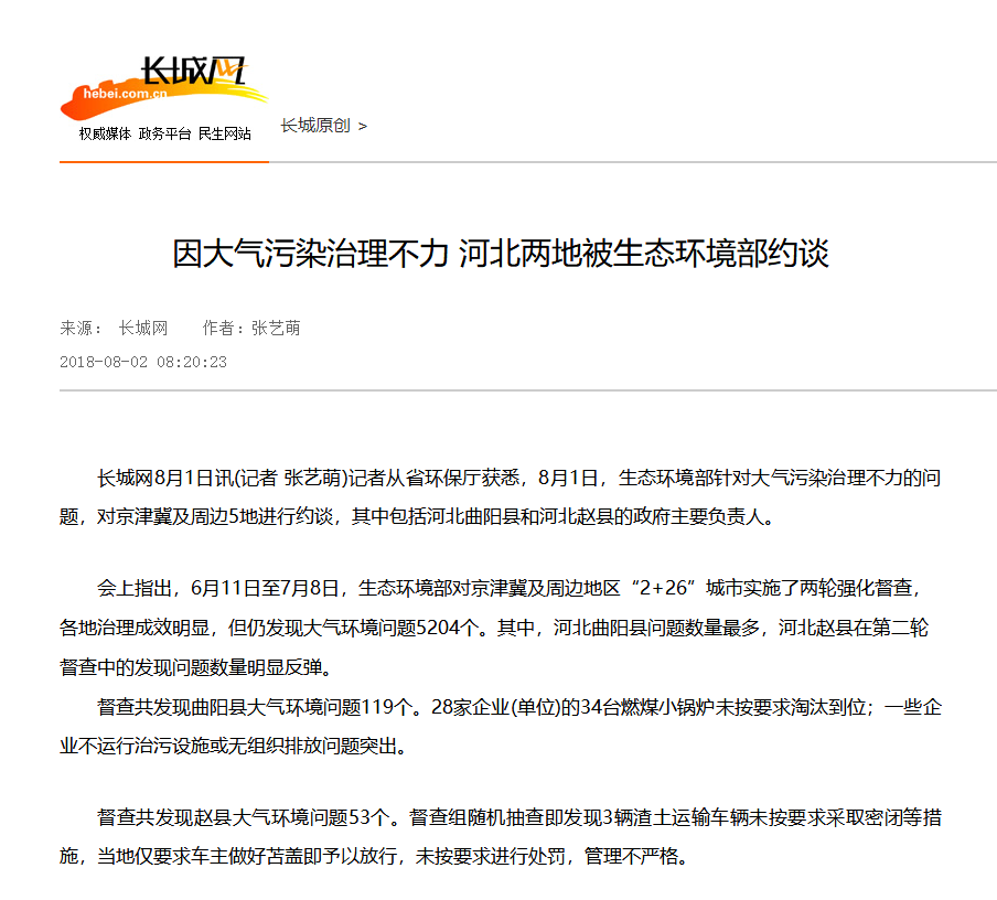 长城网8月1日讯(记者 张艺萌)记者从省环保厅获悉,8月1日,生态环境部针对大气污染治理不力的问题,对京津冀及周边5地进行约谈,其中包括河北曲阳县和河北赵县的政府主要负责人。