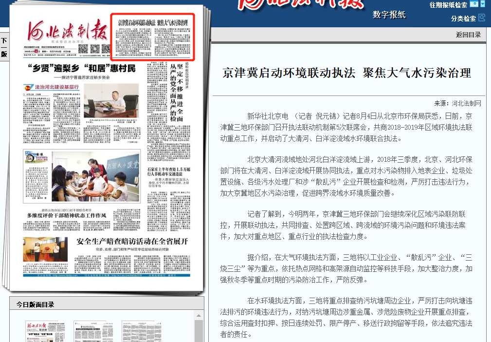 河北法制报:京津冀启动环境联动执法 聚焦大气水污染治理