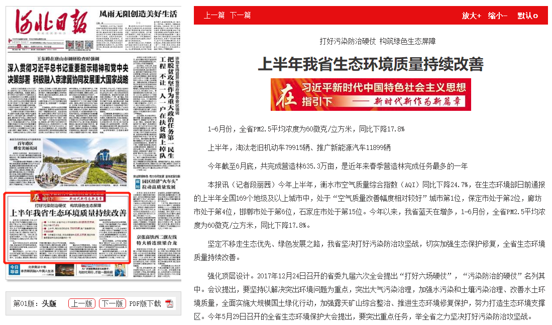 对2017年考核不合格的沧州市、定州市,实行有关责任控制单元新增排放重点水污染物建设项目环评文件限批;跟踪各地重点问题,按月逐一通报,对今年以来水污染防治问题较突出的设区市进行约谈;开展饮用水水源保护区违规项目排查整改;开展纳污坑塘再检查再复核;综合整治农村环境;持续推进海洋生态环境保护……通过多措并举,今年1-6月,我省74个地表水国家考核断面中,优良断面比例为45.9%,比今年44.6%的年度目标高1.35个百分点;劣Ⅴ类断面个数为19个,占断面总数的比例为25.7%,同比降低10.8个百分点。近岸海域优良水质比例为100%。