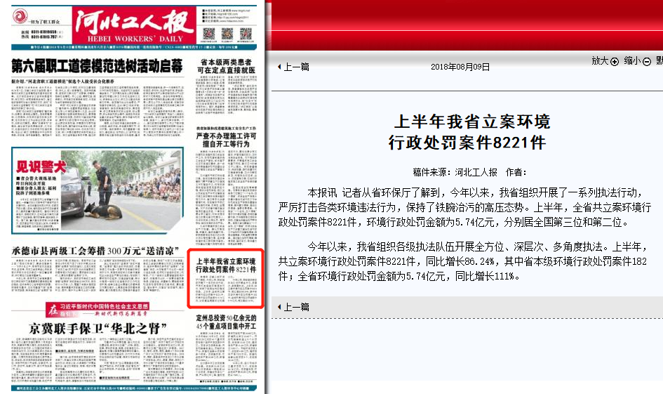 河北工人报:上半年我省立案环境行政处罚案件8221件 来源:省生态环境宣传教育中心 时间:2018-08-10
