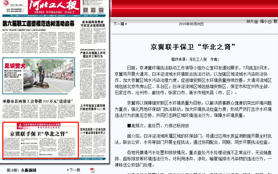 日前,京津冀环境执法联动工作领导小组办公室印发通知要求,7月底至8月末,京冀将开展大清河、白洋淀流域水环境联合执法行动,以加强区域流域水污染防治协作,加大京冀区域水污染治理力度,促进雄安新区水环境质量持续改善。大清河流域区域包括北京市房山区、丰台区;白洋淀流域区域包括雄安新区、保定市和定州市全部、石家庄市、沧州市、廊坊市、张家口市、衡水市相关县(市、区)。