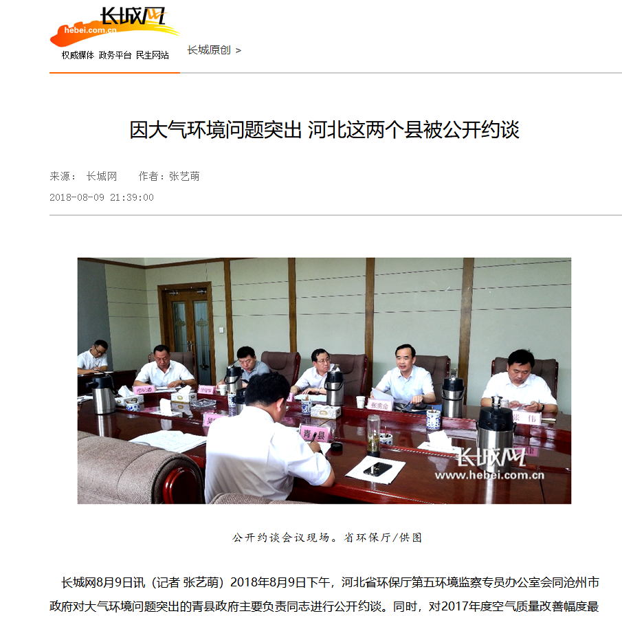 长城网8月9日讯(记者 张艺萌)2018年8月9日下午,河北省环保厅第五环境监察专员办公室会同沧州市政府对大气环境问题突出的青县政府主要负责同志进行公开约谈。同时,对2017年度空气质量改善幅度最小的吴桥县政府主要负责人进行了约谈。