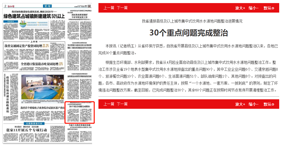 根据生态环境部、水利部要求,我省从4月起全面启动县级及以上城市集中式饮用水水源地问题整治工作。整治工作涉及全省19个地表水型集中式饮用水水源地排查出的重点问题90个,其中工业企业问题6个、交通穿越问题8个、旅游餐饮问题10个、农业面源问题6个、生活面源问题51个、部队油库问题1个、其他问题8个。对排查出的问题,各市、县政府作为水源地环境保护的责任主体,按照“一个水源地、一套方案、一抓到底”的原则,制定了环境违法问题整改方案。截至目前,已完成问题整治30个,其余60个问题正在按照时间节点有序开展清理整治工作。