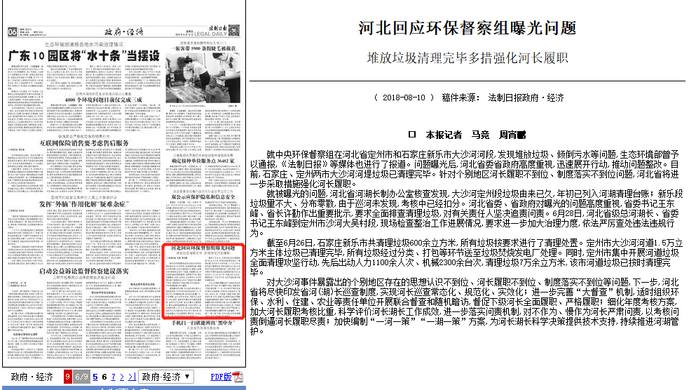就中央环保督察组在河北省定州市和石家庄新乐市大沙河河段,发现堆放垃圾、倾倒污水等问题,生态环境部曾予以通报,《法制日报》等媒体也进行了报道。问题曝光后,河北省委省政府高度重视,迅速展开行动,推动问题整改。目前,石家庄、定州两市大沙河河堤垃圾已清理完毕。针对个别地区河长履职不到位、制度落实不到位问题,河北省将进一步采取措施强化河长履职。