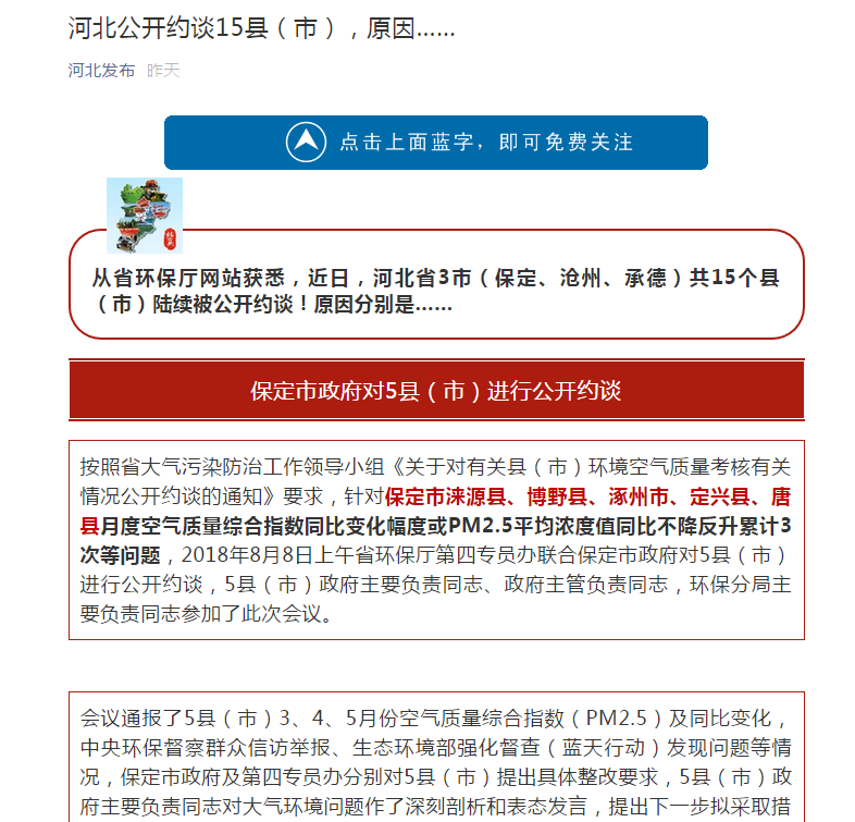 从省环保厅网站获悉,近日,河北省3市(保定、沧州、承德)共15个县(市)陆续被公开约谈!原因分别是……