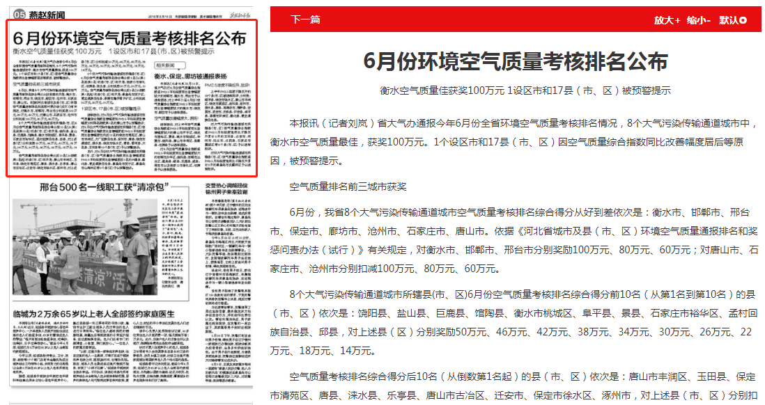 8个大气污染传输通道城市所辖县(市、区)6月份空气质量考核排名综合得分前10名(从第1名到第10名)的县(市、区)依次是:饶阳县、盐山县、巨鹿县、馆陶县、衡水市桃城区、阜平县、景县、石家庄市裕华区、孟村回族自治县、邱县,对上述县(区)分别奖励50万元、46万元、42万元、38万元、34万元、30万元、26万元、22万元、18万元、14万元。