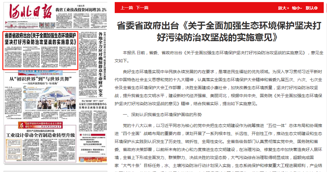 河北日报:省委省政府出台《关于全面加强生态环境保护坚决打好污染防治攻坚战的实施意见》