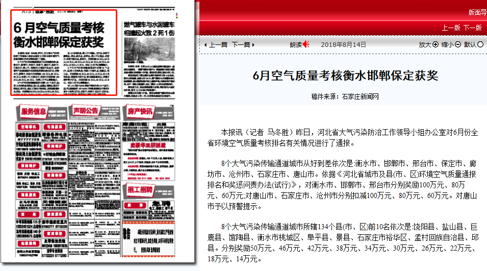 本报讯(记者 马冬胜)昨日,河北省大气污染防治工作领导小组办公室对6月份全省环境空气质量考核排名有关情况进行了通报。 8个大气污染传输通道城市从好到差依次是:衡水市、邯郸市、邢台市、保定市、廊坊市、沧州市、石家庄市、唐山市。依据《河北省城市及县(市、区)环境空气质量通报排名和奖惩问责办法(试行)》,对衡水市、邯郸市、邢台市分别奖励100万元、80万元、60万元;对唐山市、石家庄市、沧州市分别扣减100万元、80万元、60万元。对唐山市予以预警提示。 8个大气污染传输通道城市所辖134个县(市、区)前10名依次是:饶阳县、盐山县、巨鹿县、馆陶县、衡水市桃城区、阜平县、景县、石家庄市裕华区、孟村回族自治县、邱县。分别奖励50万元、46万元、42万元、38万元、34万元、30万元、26万元、22万元、18万元、14万元。 后10名依次是:唐山市丰润区、玉田县、保定市清苑区、唐县、涞水县、乐亭县、唐山市古冶区、迁安市、保定市徐水区、涿州市。分别扣减50万元、46万元、42万元、38万元、34万元、30万元、26万元、22万元、18万元、14万元。对后10名予以预警提示。 3个非大气污染传输通道城市所辖34个县(市、区)前3名依次是:张家口市崇礼区、沽源县、张北县。分别奖励30万元、20万元、10万元;后3名依次是:秦皇岛市抚宁区、青龙满族自治县、承德市鹰手营子矿区。分别扣减30万元、20万元、10万元。对后3名予以预警提示。 对1-6月份PM2.5浓度不降反升的18个县(市、区)予以通报批评。对PM2.5月均浓度值同比不降反升累计2次的玉田县、迁安市、河间市、任丘市、迁西县、石家庄市藁城区、秦皇岛市北戴河区予以通报批评。