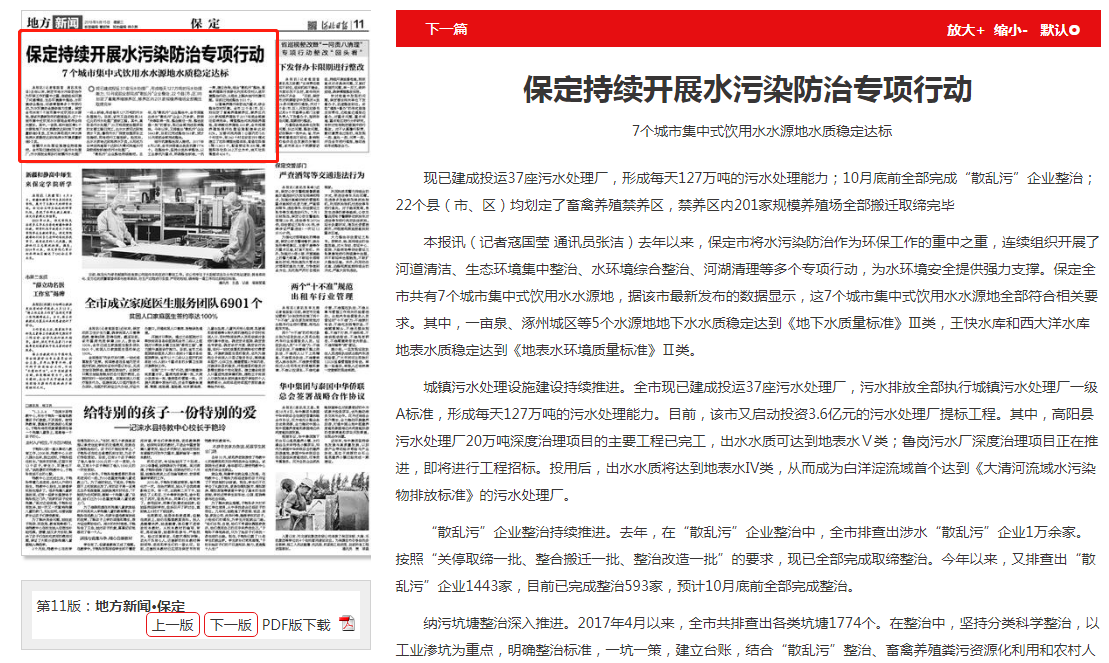 城镇污水处理设施建设持续推进。全市现已建成投运37座污水处理厂,污水排放全部执行城镇污水处理厂一级A标准,形成每天127万吨的污水处理能力。目前,该市又启动投资3.6亿元的污水处理厂提标工程。其中,高阳县污水处理厂20万吨深度治理项目的主要工程已完工,出水水质可达到地表水Ⅴ类;鲁岗污水处理厂深度治理项目正在推进,即将进行工程招标。投用后,出水水质将达到地表水Ⅳ类,从而成为白洋淀流域首个达到《大清河流域水污染物排放标准》的污水处理厂。