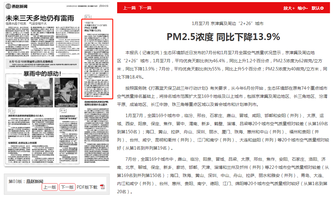 燕赵都市报:1月至7月 京津冀及周边“2+26”城市 PM2.5浓度 同比下降13.9%