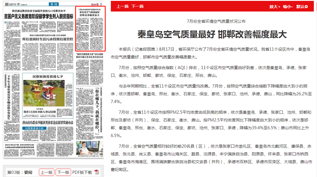 河北日报: 7月份全省环境空气质量状况公布 秦皇岛空气质量最好 邯郸改善幅度最大