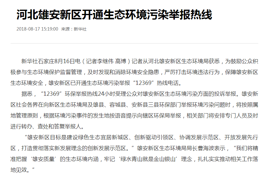 新华社:河北雄安新区开通生态环境污染举报热线