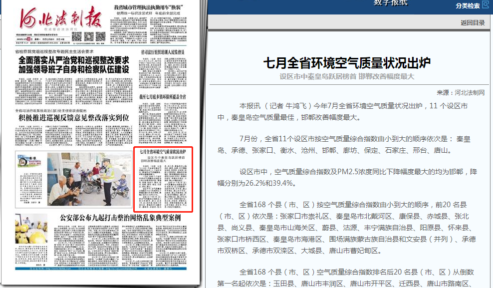 本报讯 (记者 牛鸿飞)今年7月全省环境空气质量状况出炉,11 个设区市中,秦皇岛空气质量最佳,邯郸改善幅度最大。