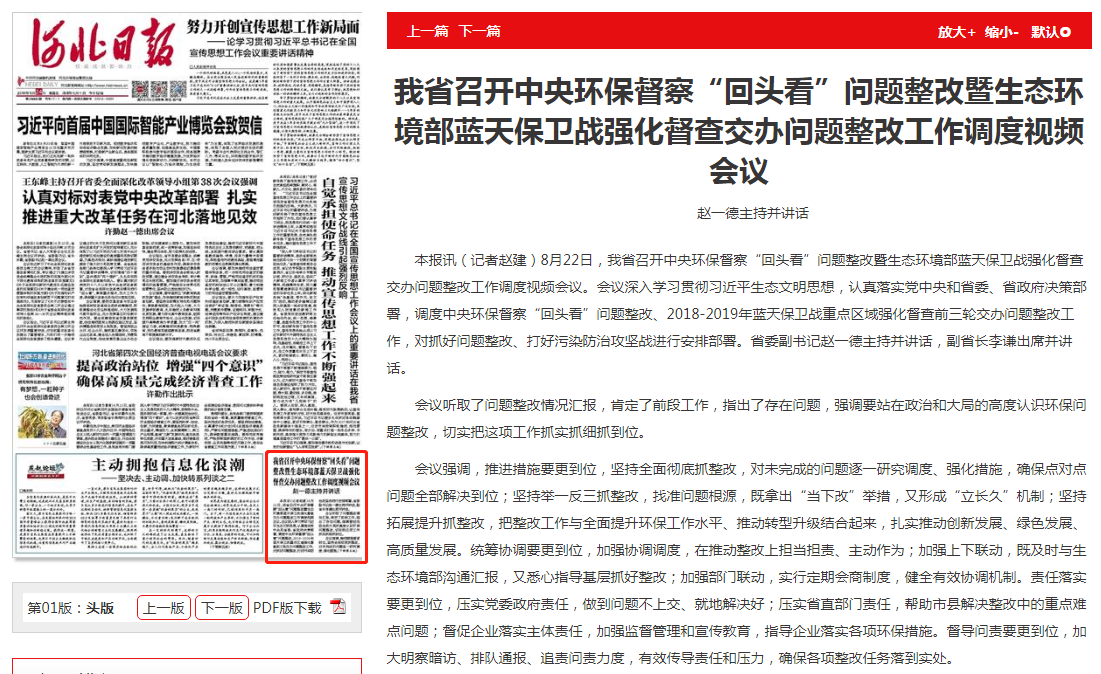 河北日报:我省召开中央环保督察“回头看”问题整改暨生态环境部蓝天保卫战强化督查交办问题整改工作调度视频会议