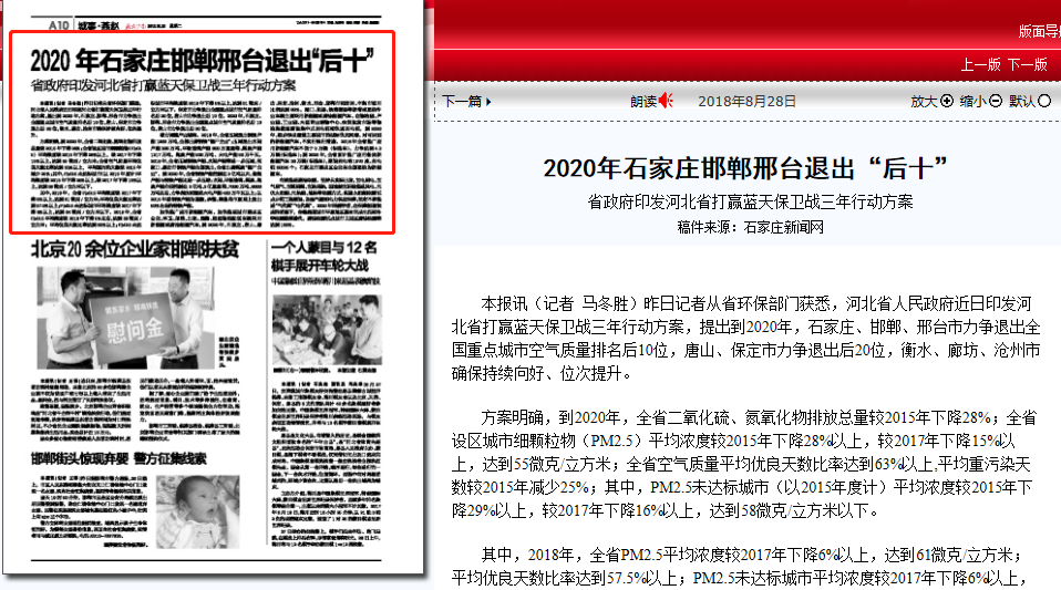 其中,2018年,全省PM2.5平均浓度较2017年下降6%以上,达到61微克/立方米;平均优良天数比率达到57.5%以上;PM2.5未达标城市平均浓度较2017年下降6%以上,达到64微克/立方米以下。2019年,全省PM2.5平均浓度较2018年下降5%左右,达到58微克/立方米;平均优良天数比率达到60%以上;PM2.5未达标城市平均浓度较2018年下降5%以上,达到61微克/立方米以下。保定市力争退出全国重点城市空气质量排名后20位,唐山市力争退出后10位。2020年,石家庄、邯郸、邢台市力争退出全国重点城市空气质量排名后10位,唐山市力争退出后20位。