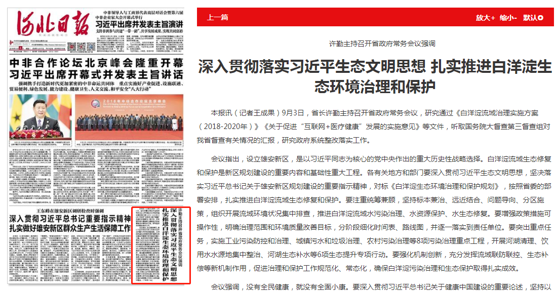 河北日报:深入贯彻落实习近平生态文明思想 扎实推进白洋淀生态环境治理和保护