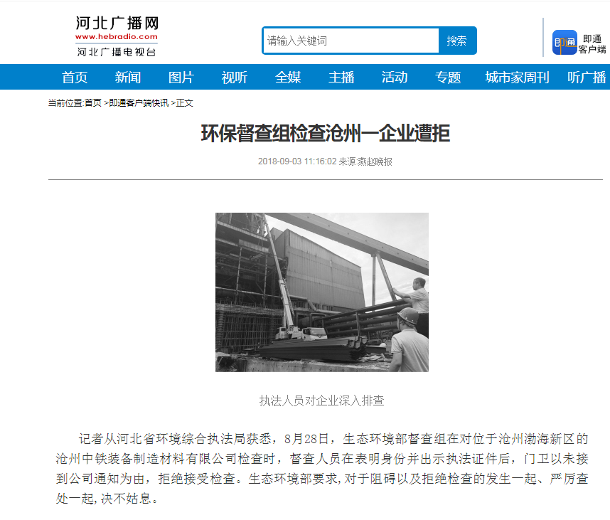 记者从河北省环境综合执法局获悉,8月28日,生态环境部督查组在对位于沧州渤海新区的沧州中铁装备制造材料有限公司检查时,督查人员在表明身份并出示执法证件后,门卫以未接到公司通知为由,拒绝接受检查。生态环境部要求,对于阻碍以及拒绝检查的发生一起、严厉查处一起,决不姑息。