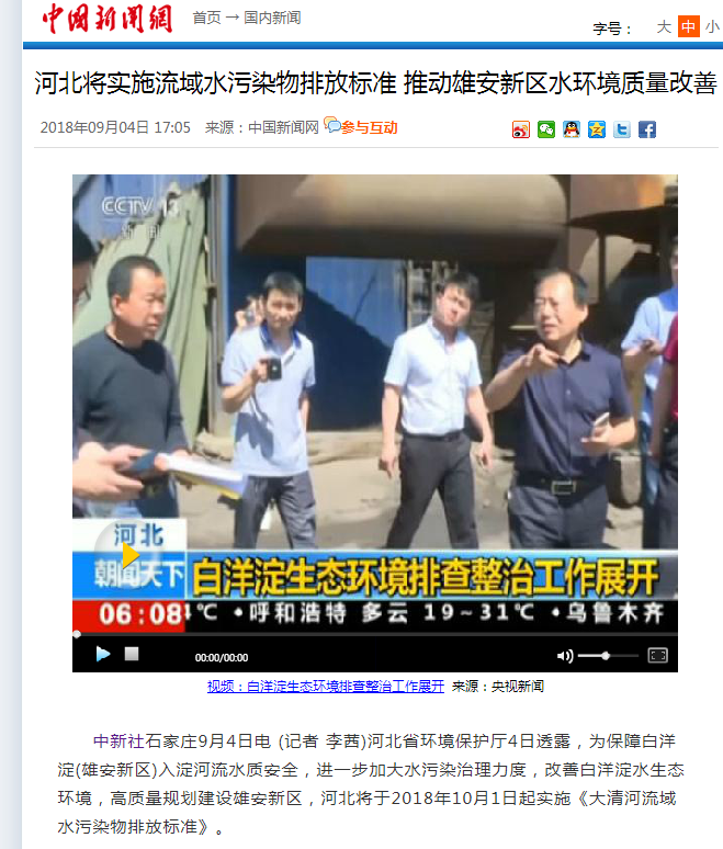 中新社:河北将实施流域水污染物排放标准 推动雄安新区水环境质量改善