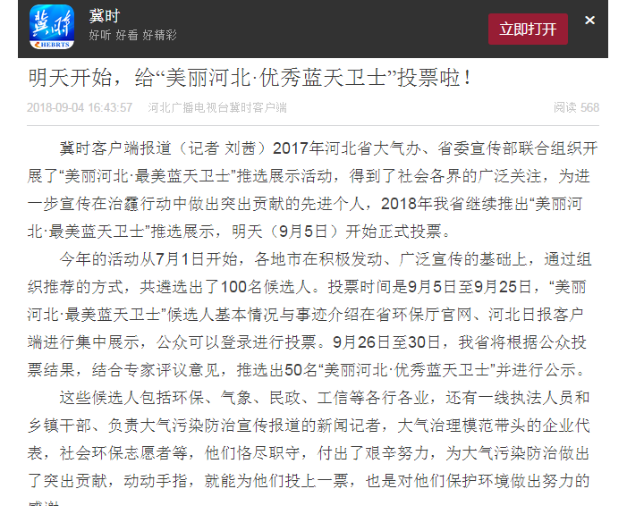 冀时客户端报道(记者 刘茜)2017年河北省大气办、省委宣传部联合组织开展了“美丽河北·最美蓝天卫士”推选展示活动,得到了社会各界的广泛关注,为进一步宣传在治霾行动中作出突出贡献的先进个人,2018年我省继续推出“美丽河北·最美蓝天卫士”推选展示,明天(9月5日)开始正式投票。