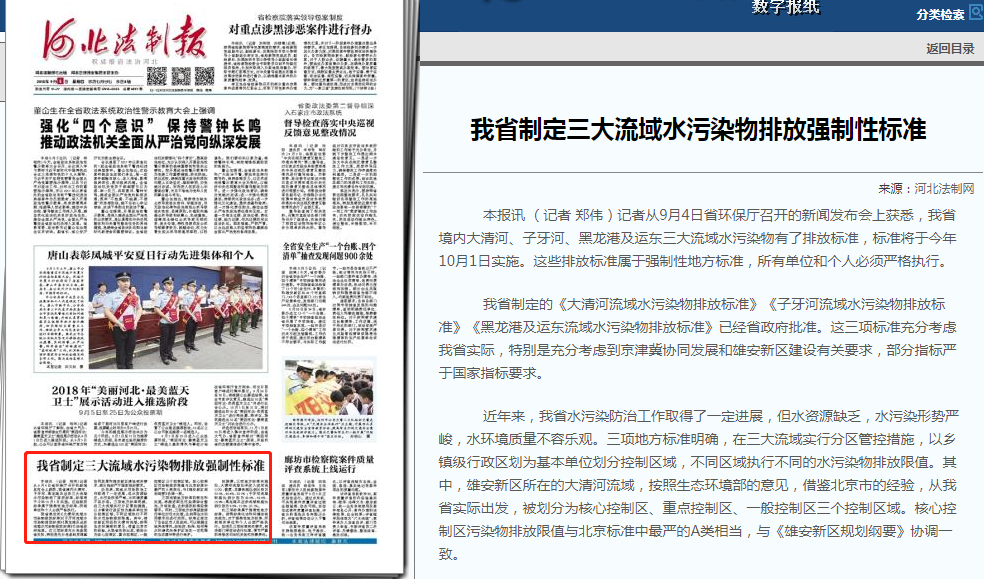我省制定的《大清河流域水污染物排放标准》《子牙河流域水污染物排放标准》《黑龙港及运东流域水污染物排放标准》已经省政府批准。这三项标准充分考虑我省实际,特别是充分考虑到京津冀协同发展和雄安新区建设有关要求,部分指标严于国家指标要求。