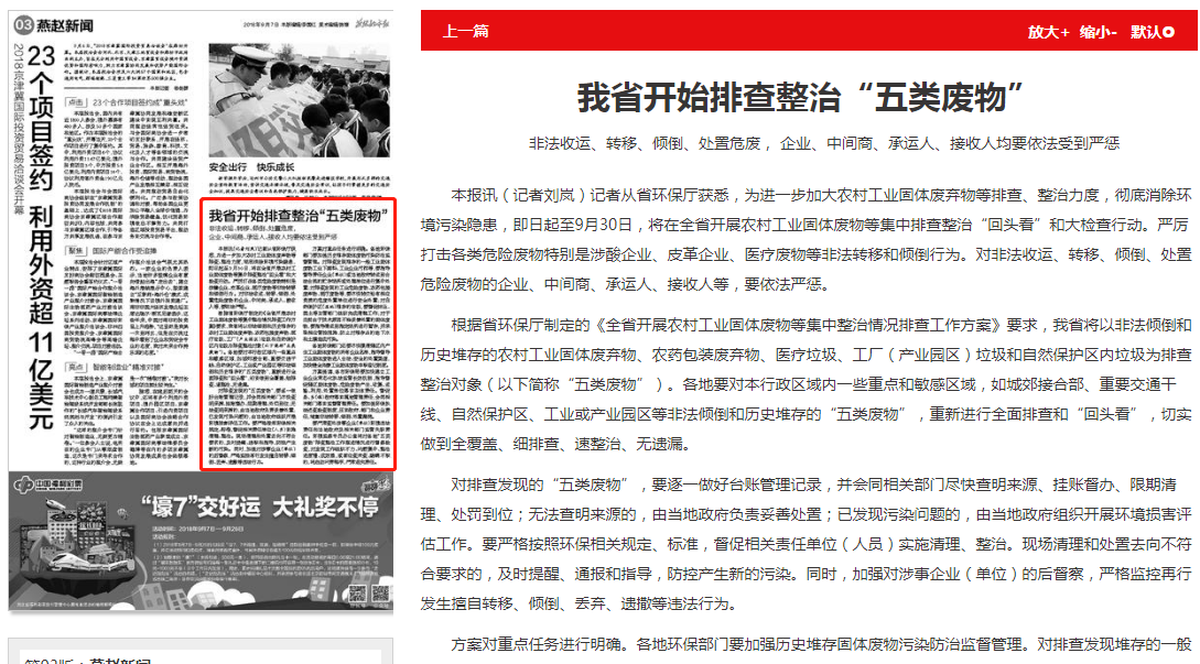 根据省环保厅制定的《全省开展农村工业固体废物等集中整治情况排查工作方案》要求,我省将以非法倾倒和历史堆存的农村工业固体废弃物、农药包装废弃物、医疗垃圾、工厂(产业园区)垃圾和自然保护区内垃圾为排查整治对象(以下简称“五类废物”)。各地要对本行政区域内一些重点和敏感区域,如城郊接合部、重要交通干线、自然保护区、工业或产业园区等非法倾倒和历史堆存的“五类废物”,重新进行全面排查和“回头看”,切实做到全覆盖、细排查、速整治、无遗漏。