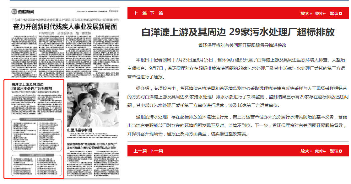 本报讯(记者刘岚)7月25日至8月15日,省环保厅组织开展了白洋淀上游及其周边生态环境大排查、大整治专项检查。9月7日,省环保厅对存在超标排放违法问题的29家污水处理厂及其中16家污水处理厂委托的第三方运营单位进行了通报。