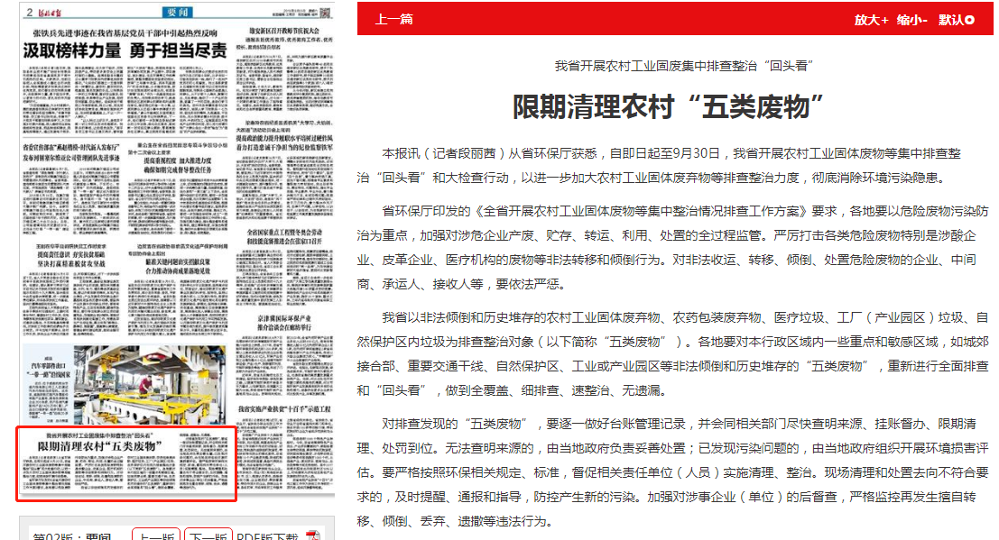 河北日报: 我省开展农村工业固废集中排查整治“回头看” 限期清理农村“五类废物”