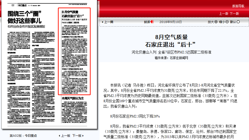 燕赵晚报:8月空气质量 石家庄退出“后十”