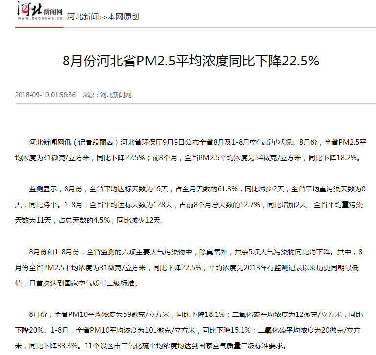 河北新闻网:8月份河北省PM2.5平均浓度同比下降22.5%