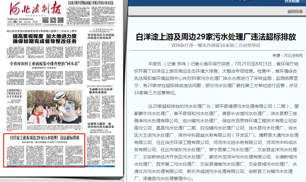河北法制报: 白洋淀上游及周边29家污水处理厂违法超标排放