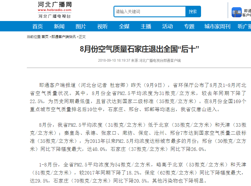 河北广播电视台即通客户端:8月份空气质量石家庄退出全国“后十”