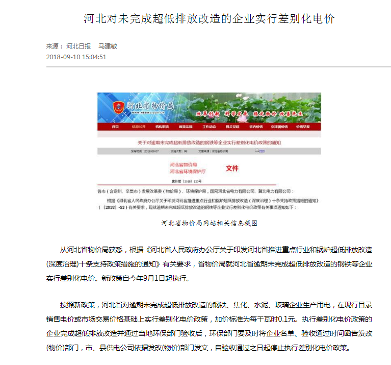 河北新闻网:河北对未完成超低排放改造的企业实行差别化电价