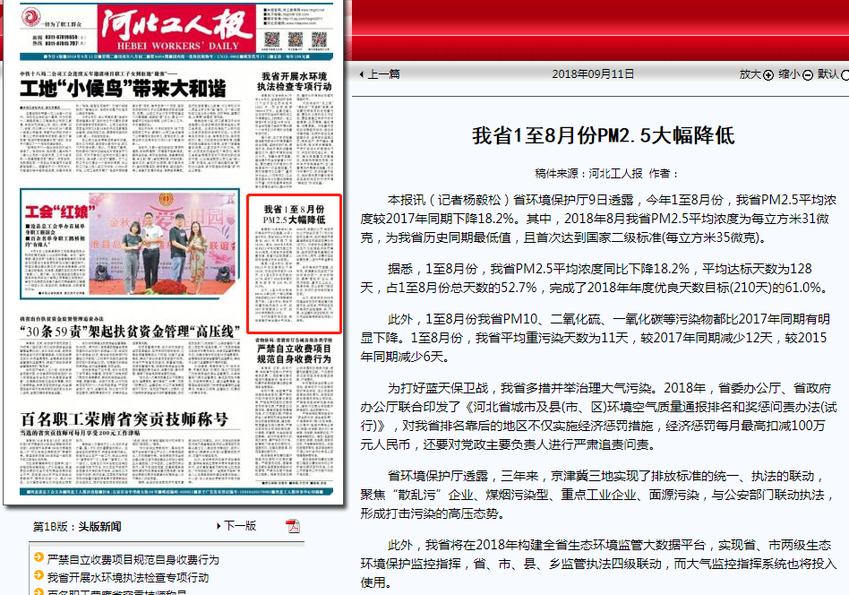 为打好蓝天保卫战,我省多措并举治理大气污染。2018年,省委办公厅、省政府办公厅联合印发了《河北省城市及县(市、区)环境空气质量通报排名和奖惩问责办法(试行)》,对我省排名靠后的地区不仅实施经济惩罚措施,经济惩罚每月最高扣减100万元人民币,还要对党政主要负责人进行严肃追责问责。