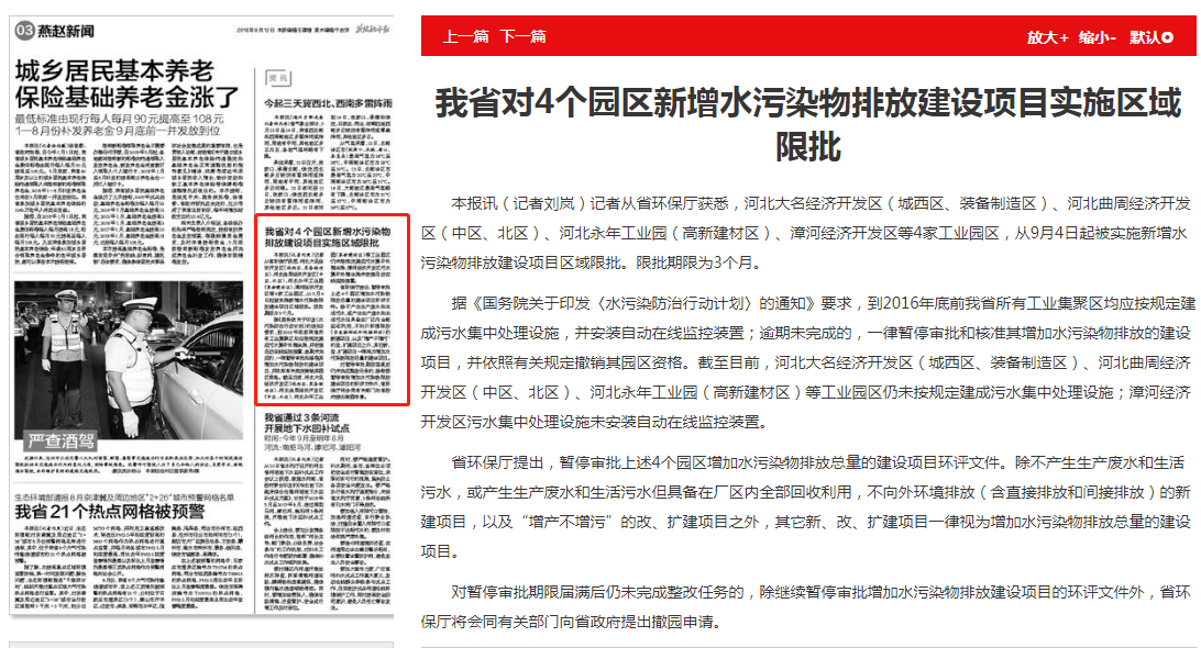 燕赵都市报:我省对4个园区新增水污染物排放建设项目实施区域限批